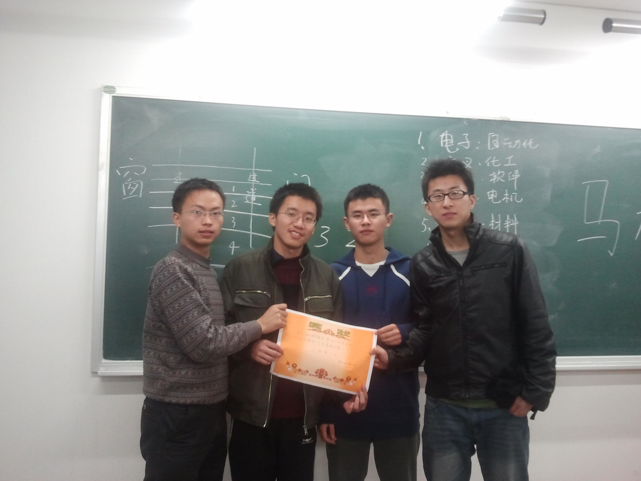 在2012年3月24日上下午举行的马约翰杯乔丹体育定向越野比赛中,我院傅昊、蒋译瑶、盛健、蒋宁、董宇茜、赵铄耀六位同学组成的交叉信息院队和其他院系同学斗智斗勇斗体力,经过校内和校外两场比赛的激烈角逐,胜利完成任务,最终获得乙组第六名的好成绩!