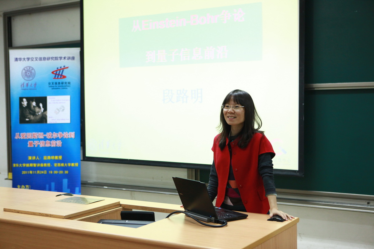 2011年11月24日晚,清华大学姚期智讲座教授、密西根大学教授段路明在北京大学物理学院中楼212教室作了一场主题演讲:《从爱因斯坦、玻尔争论到量子信息前沿》。清华大学交叉信息院副院长王跃宣教授主持讲座并做招生宣讲,来自北大、清华的学生共同聆听演讲。