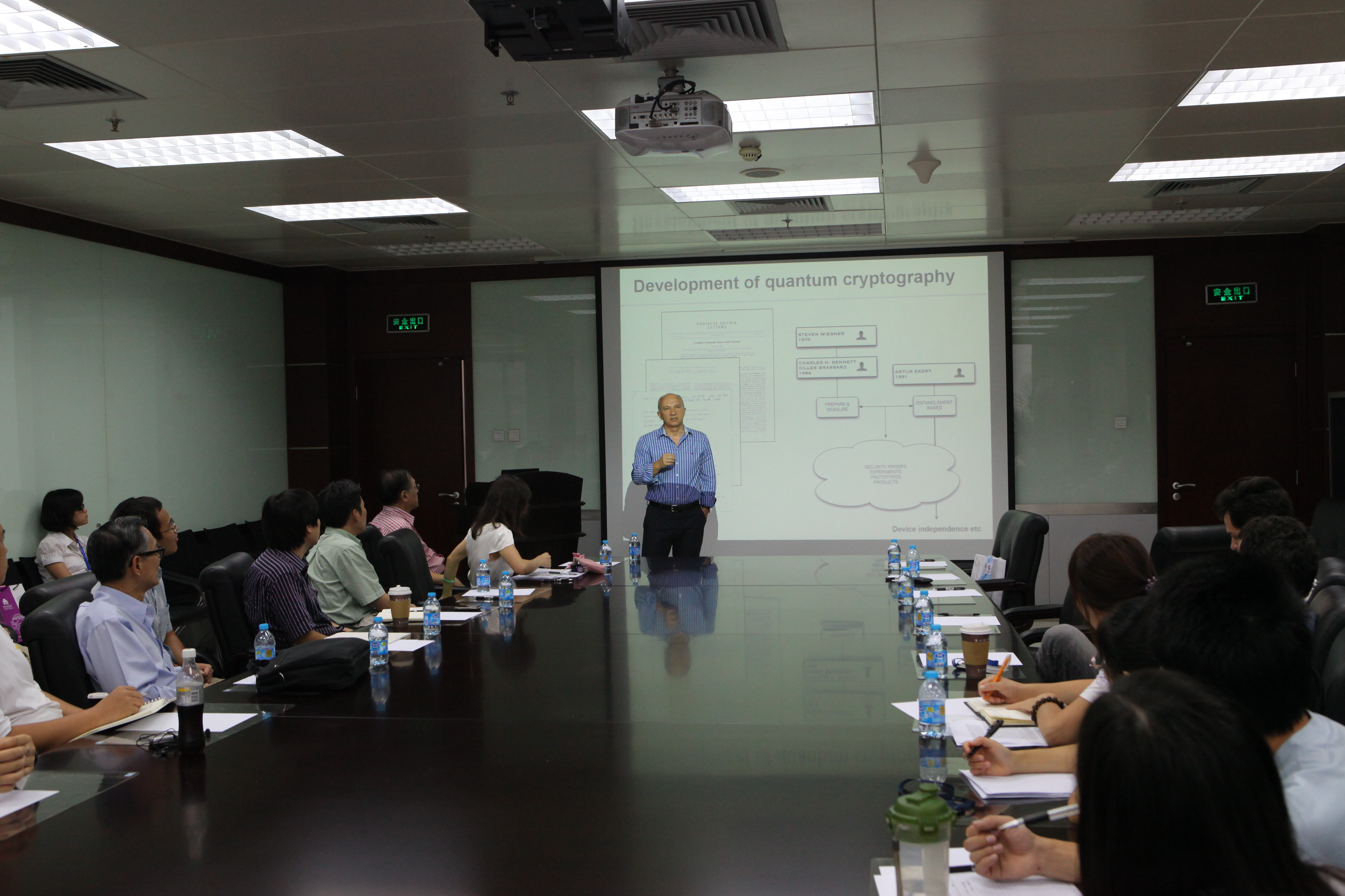 访问期间,Artur Ekert教授一行在FIT楼4-603会议室与交叉信息院和量子信息中心师生进行座谈,王跃宣教授主持座谈。姚期智院士介绍了我院的整体科研工作情况。姚院士指出,中国科教兴国人才是关键,今后5年国家将会在人才培养方面投入大量精力,而清华正是这方面的先锋。姚院士还强调,我院未来的工作重点之一将一如既往是国际交流合作,期待能与新加坡量子技术中心加强学术往来。段路明教授和Kihwan Kim副教授介绍了清华量子信息中心的科研工作并展望了未来的发展蓝图。院研究生祖充和刘可则分别介绍了各自的科研工作,并与来访学者深入探讨相关问题。