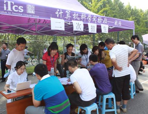 综合体育馆西侧操场一片喧嚣,各个院系的迎新点热闹非凡。“姚班”二次招生报名点也在其中,现场接受新生和家长的咨询、报名。一大早,很多新生和家长就慕名而来。除了计算机系的学生,不少来自自动化系、材料工程系及医学院的学生也热切表达了对加入“姚班”的期待。多数新生当场就在报名点填写报名表,表上密密麻麻的“获奖经历”充分证明了过去的光环,而眼前“姚班”一纸报名表,即将开启未来的精彩。部分“姚班”学生和理论计算机科学研究中心研究生也参与了今天的二次招生活动,他们以学长、学姐的身份与准师弟师妹们分享了自己对于“姚班”教学特色的理解以及在“姚班”的学习感受。“姚班”核心课程教师孙晓明百忙之中也到招生现场指导工作,并与新生及家长面对面交流、耐心解疑。