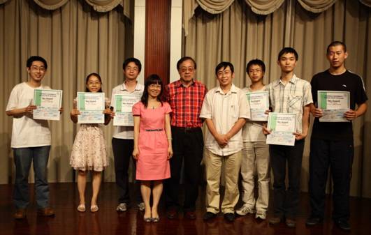 班会上姚期智先生还为计70颁发了本年度的“姚奖学金(Yao Award)”。“姚奖学金”是姚先生从自己的科研经费中拨出专款专门设立的奖项,每个学年末面向姚班三年级优秀学生颁发,旨在表彰和奖励姚班学生德、智、体、美、劳各方面的全面发展,特别是在学习和科研上取得的优异成绩和突出成果。今年共有6名学生获奖:石礼昕(一等奖),杜圆、张远(二等奖),苏洲跃、顾钊铨、王子贺(三等奖)。在颁奖台上,学生们与姚先生一一合影留念,并发表获奖感言,特别感谢了姚先生和中心的肯定与鼓励。