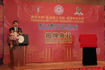 今天,清华大学与麻省理工学院、香港中文大学合作成立理论计算机科学研究中心,并隆重举行揭牌仪式。在此,请允许我代表教育部,并以我个人的名义,向致力于祖国科学发展的姚期智先生表示崇高的敬意,向研究中心的专家委员会全体委员表示衷心的感谢,向清华大学的全体师生员工表示热烈的祝贺。