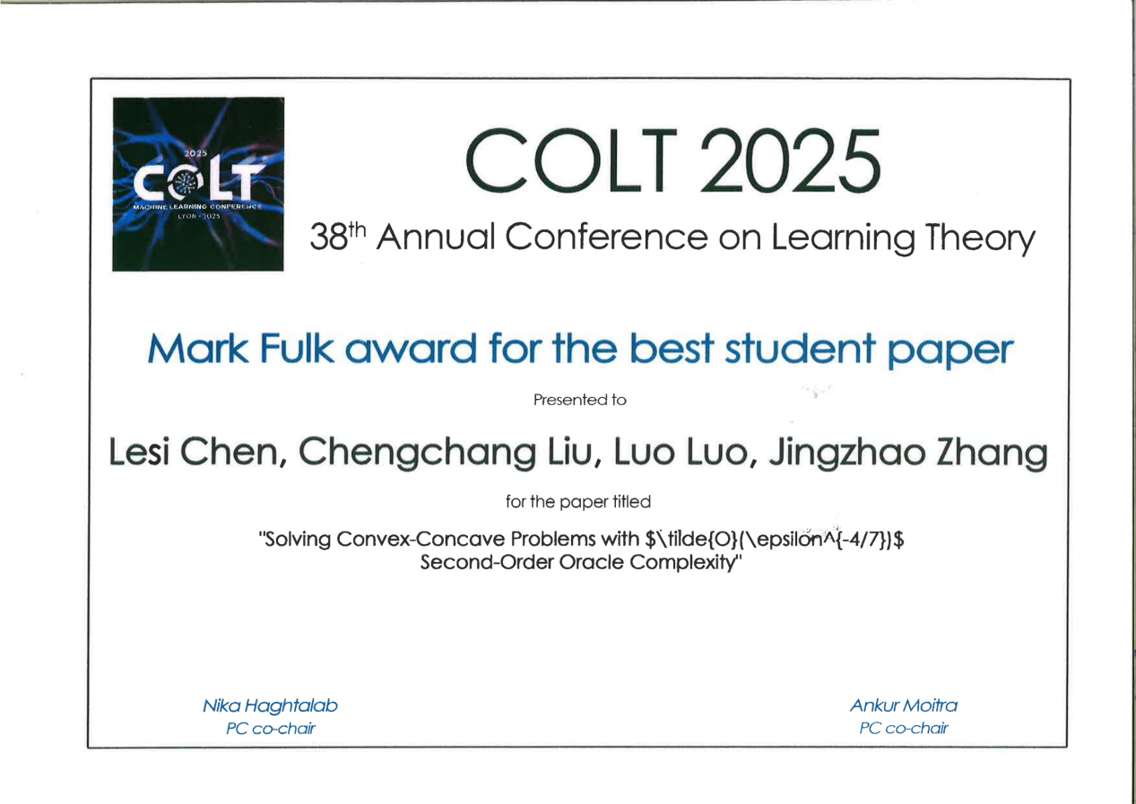 近日,清华大学交叉信息院博士生陈乐偲和张景昭助理教授的科研成果“Solving Convex-Concave Problems with O(ϵ−4/7) Second-Order Oracle Complexity”在机器学习理论的国际顶级会议Conference on Learning Theory (COLT) 2025上荣获最佳学生论文奖。